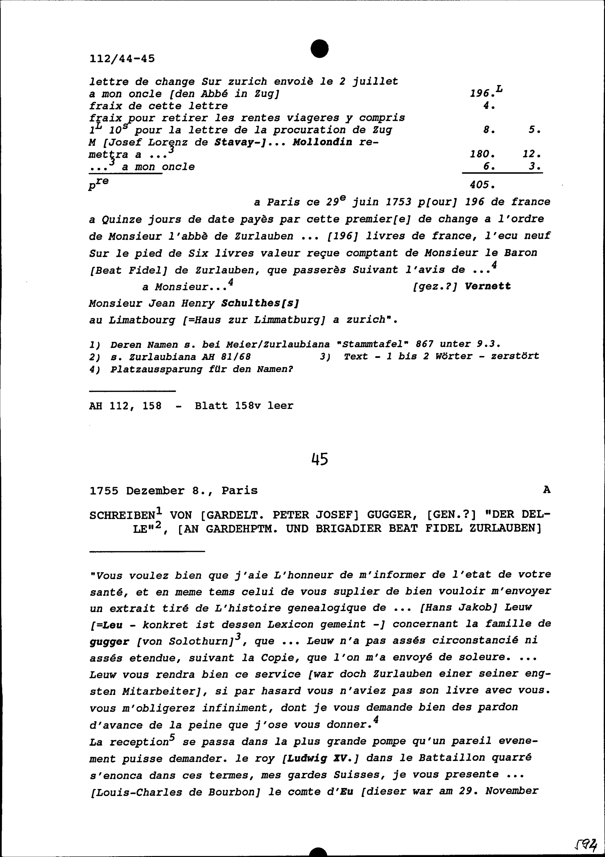 Schreiben von Peter Josef Gugger, Gardeleutnant, genannt der Delle, an Beat Fidel Zurlauben, Gardehauptmann und Brigadier