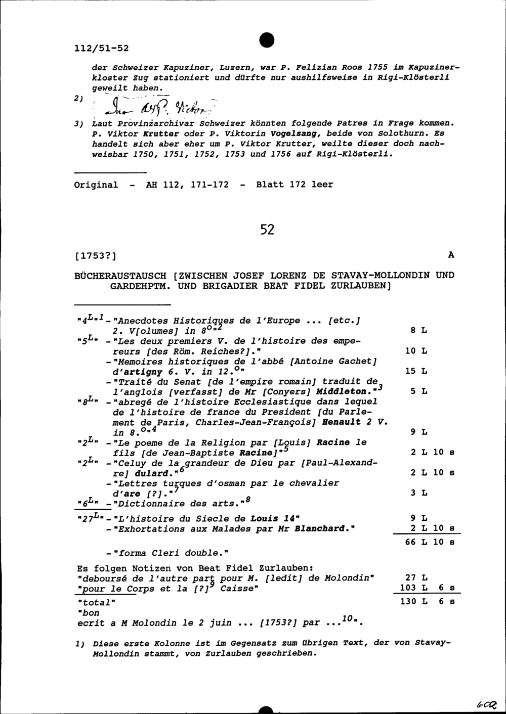 Bücheraustausch zwischen Josef Lorenz de Stavay-Mollondin und Beat Fidel Zurlauben, Gardehauptmann und Brigadier