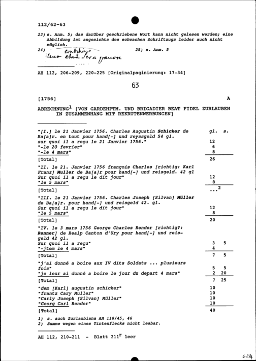 Abrechnung von Beat Fidel Zurlauben, Gardehauptmann und Brigadier, in Zusammenhang mit Rekrutenwerbungen