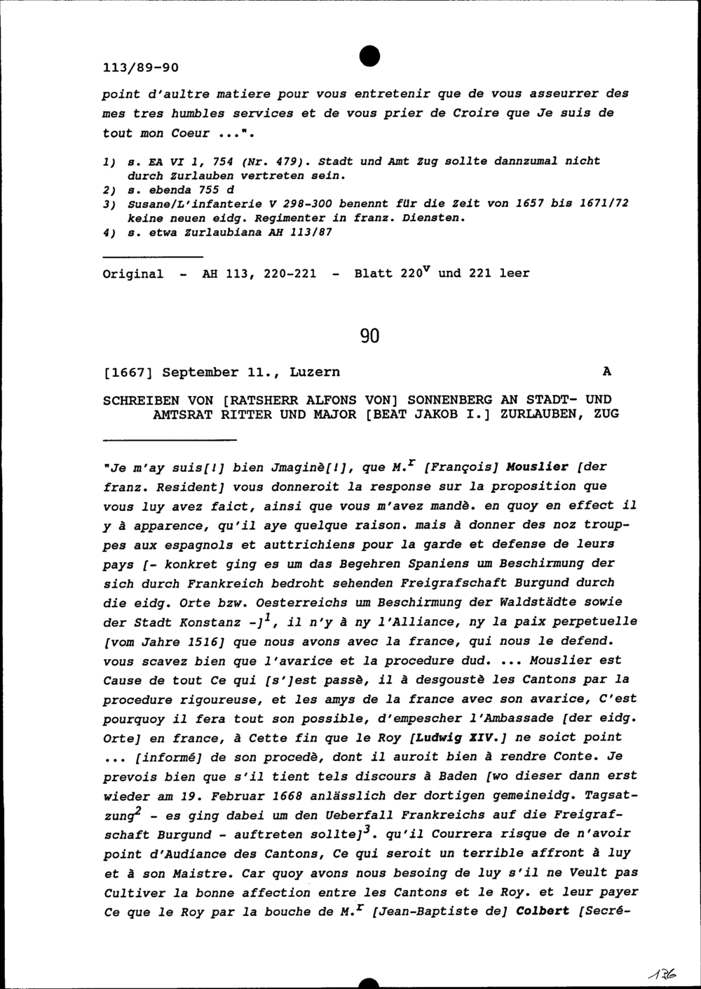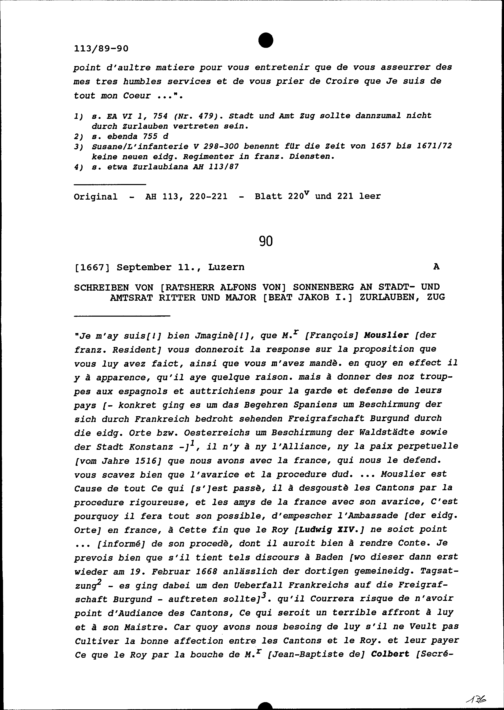 Schreiben von Alfons von Sonnenberg, Ratsherr, an Beat Jakob I. Zurlauben, Stadt- und Amtrat und Major, Zug