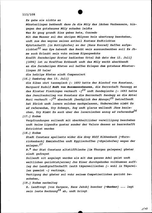 Notiz von Beat Kaspar Zurlauben, Tagsatzungsgesandter von Stadt und Amt Zug, über die am 30. Juni 1697 begonnene Jahrrechnung in Baden betreffend Gemeine Herrschaften