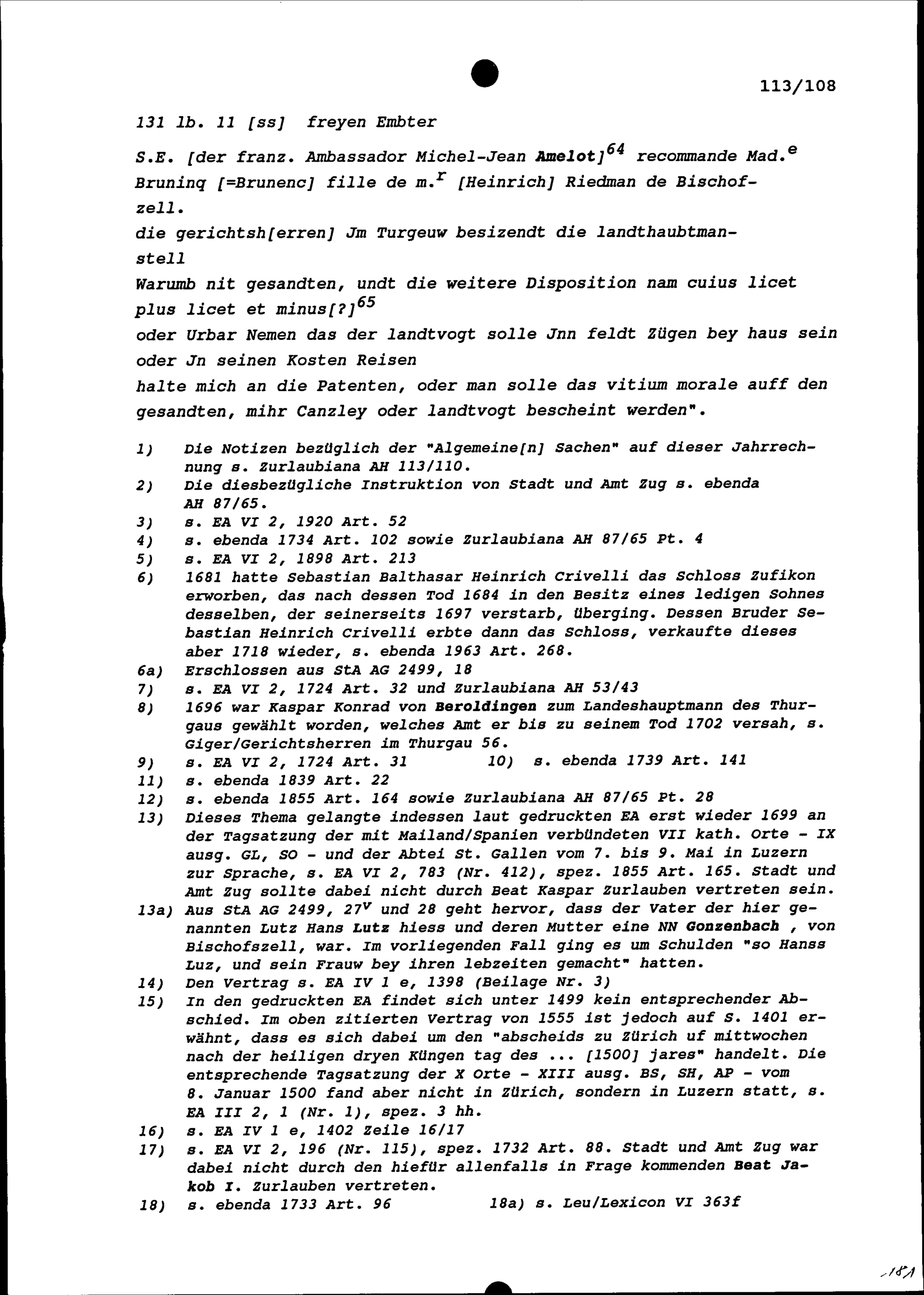 Notiz von Beat Kaspar Zurlauben, Tagsatzungsgesandter von Stadt und Amt Zug, über...