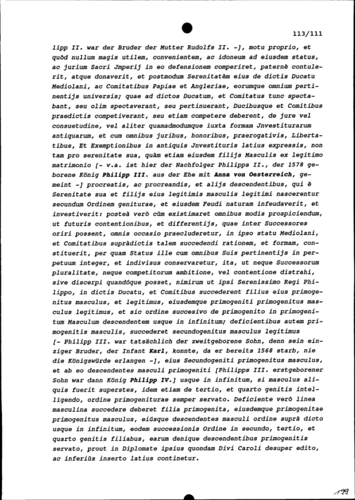 Ausführliche Abhandlung über die Erfolge (beispielsweise des kinderlos gebliebenen, Karl II., König von Spanien): Caesarea confirmation investiturarum, seu nova investitura feudalis Status Mediolani facta per imperatorem Rudolpheum II. in potentissimum regem Philippum II. et successores tam masculos, quam foeminas