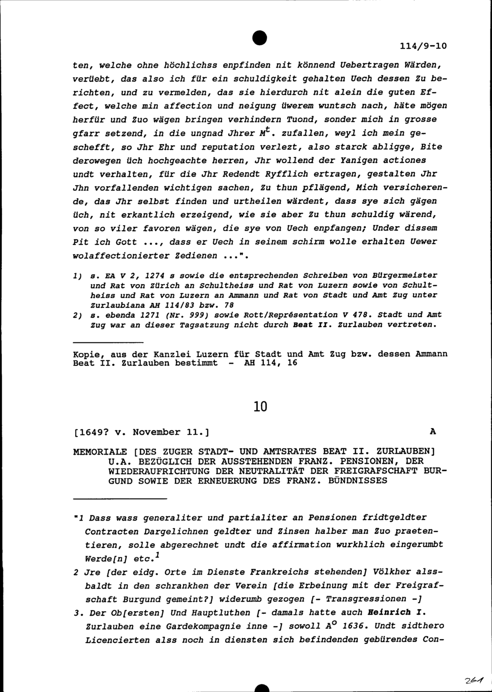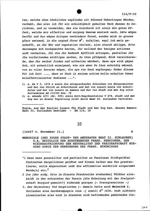 Bericht von Beat II. Zurlauben, Stadt- und Amtrat Zug, unter anderem bezüglich der ausstehenden französischen Pensionen, der Wiederaufrichtung der Neutralität der Freigrafschaft Burgund sowie der Erneuerung des französischen Bündnisses
