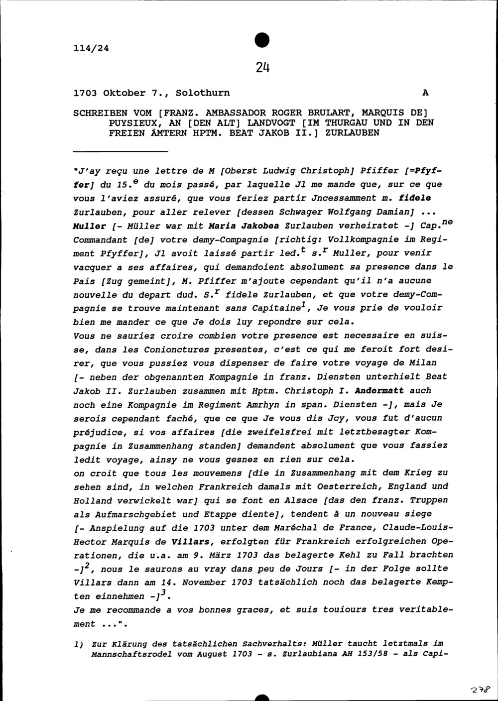 Schreiben von Roger Brûlart, Marquis de Puysieux, Ambassador von Frankreich, an Beat Jakob II. Zurlauben, Altlandvogt im Thurgau und in den Freien Ämter und Hauptmann