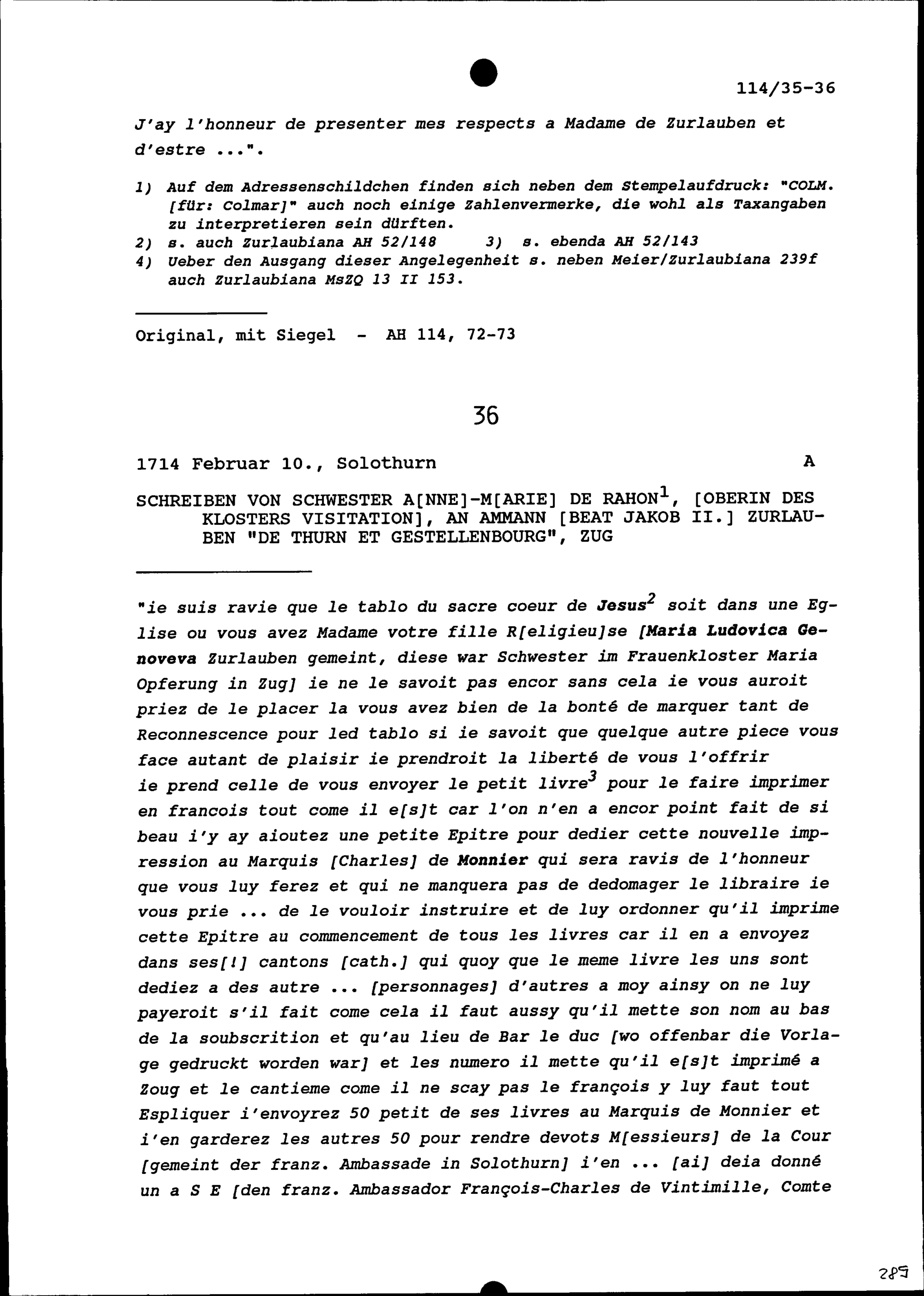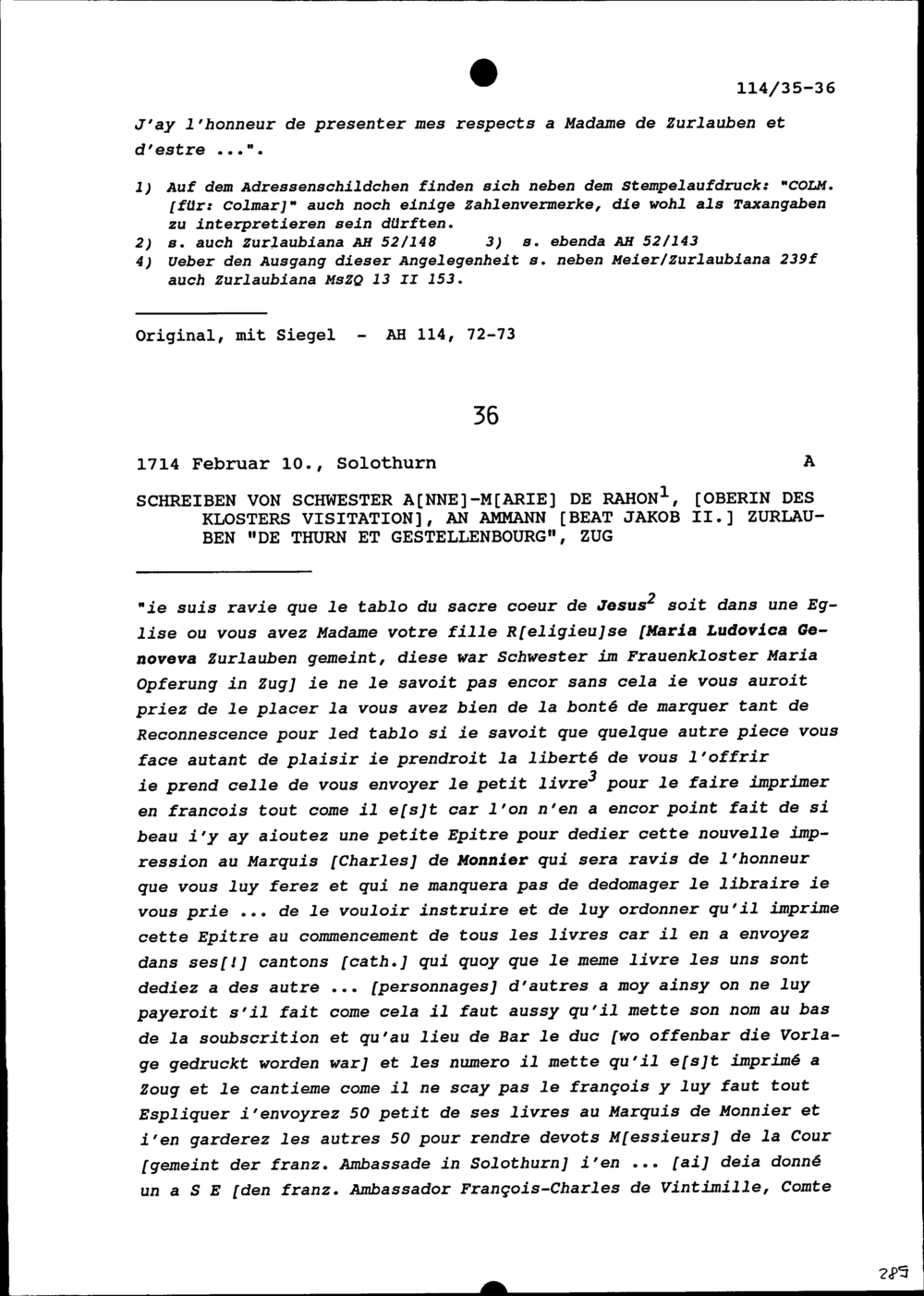 Schreiben von Anne-Marie de Rahon, Klosterfrau und Oberin des Klosters Visitation, an Beat Jakob II. Zurlauben, Ammann, Zug
