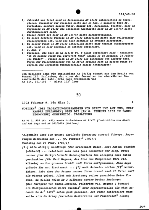 Notiz von Beat Kaspar Zurlauben, Tagsatzungsgesandter von Stadt und Amt Zug, über die am 8. Februar 1702 in Baden begonnene Tagsatzung