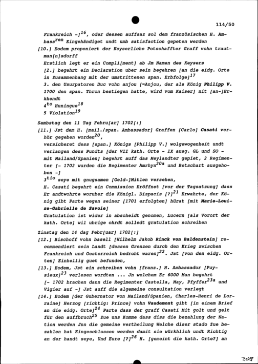 Notiz von Beat Kaspar Zurlauben, Tagsatzungsgesandter von Stadt und Amt Zug, über die am 8. Februar 1702 in Baden begonnene Tagsatzung