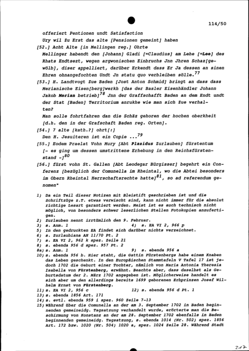 Notiz von Beat Kaspar Zurlauben, Tagsatzungsgesandter von Stadt und Amt Zug, über die am 8. Februar 1702 in Baden begonnene Tagsatzung