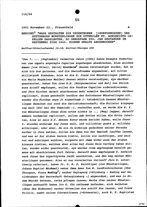 Bericht der Dorfgenossen des Gottshauses Münsterlingen über die zu Uttwil abgebrochene Sankt Adelheidkapelle
