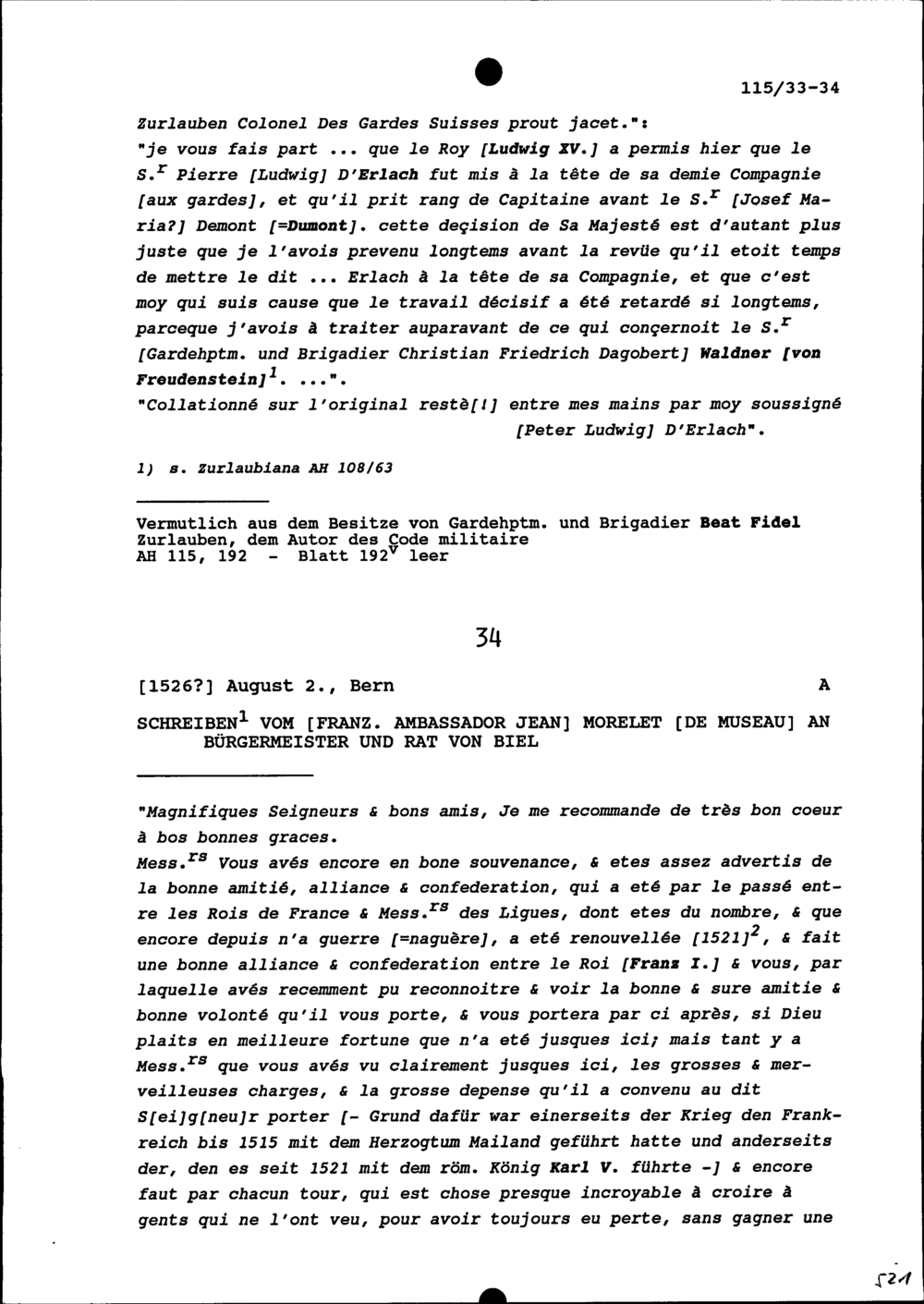 Schreiben von Jean Morelet de Museau, Ambassador von Frankreich, an Bürgermeister und Rat von Biel