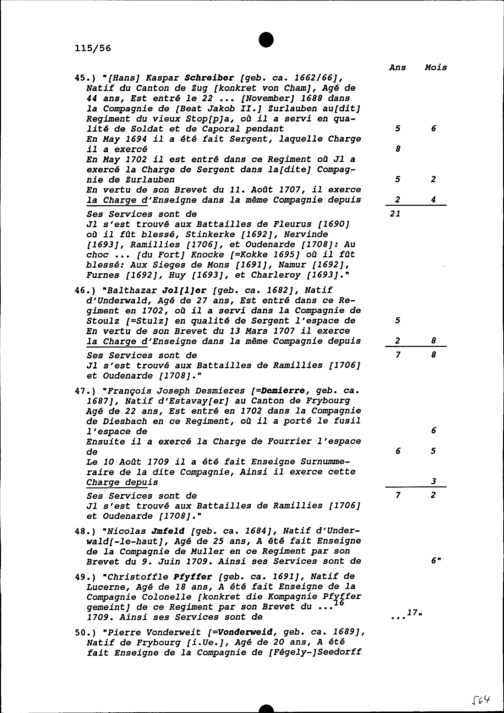 Dienstleistungen der Offiziere des Schweizer Regiments Pfyffer, November 1709