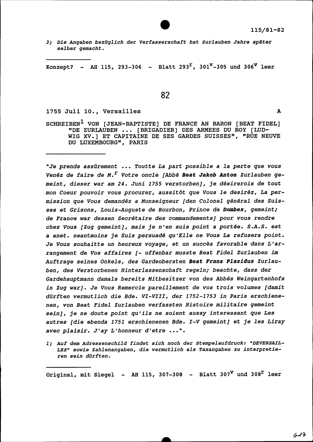 Schreiben von Jean-Baptiste de France an Beat Fidel Zurlauben, Brigadier, Paris