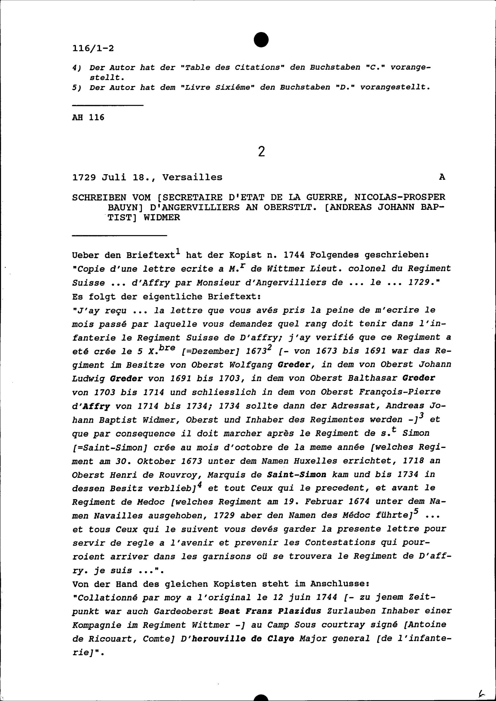 Schreiben von Nicolas-Prosper Bauyn d'Angervilliers, Staatskriegsminister, an Andreas Johann Baptist Widmer, Oberstleutnant