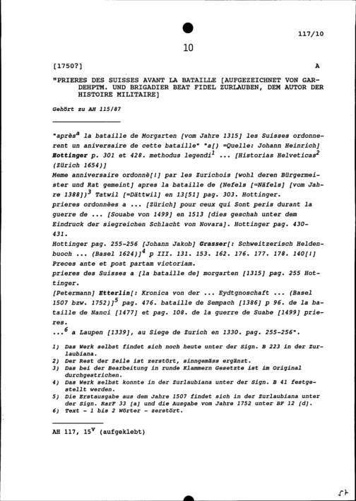 Hinweise auf das Gebet der Schweizer vor einer Schlacht, aufgezeichnet von Beat Fidel Zurlauben, Gardehauptmann und Brigadier