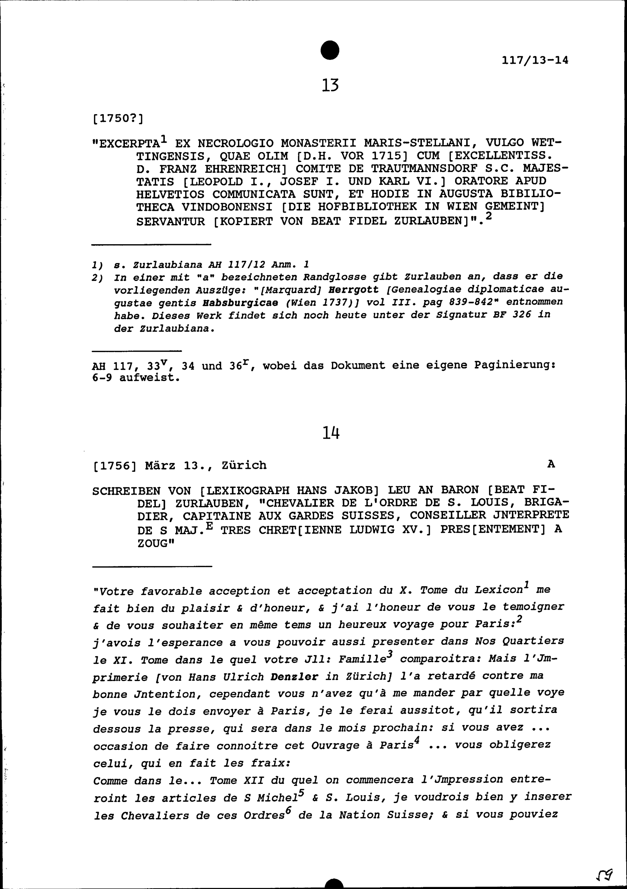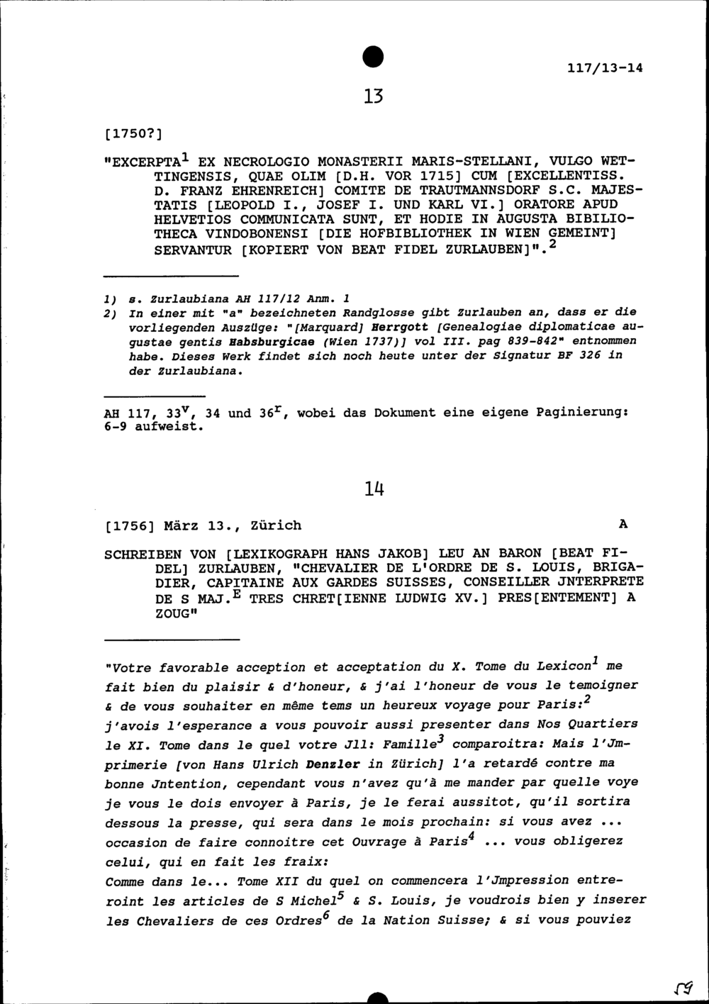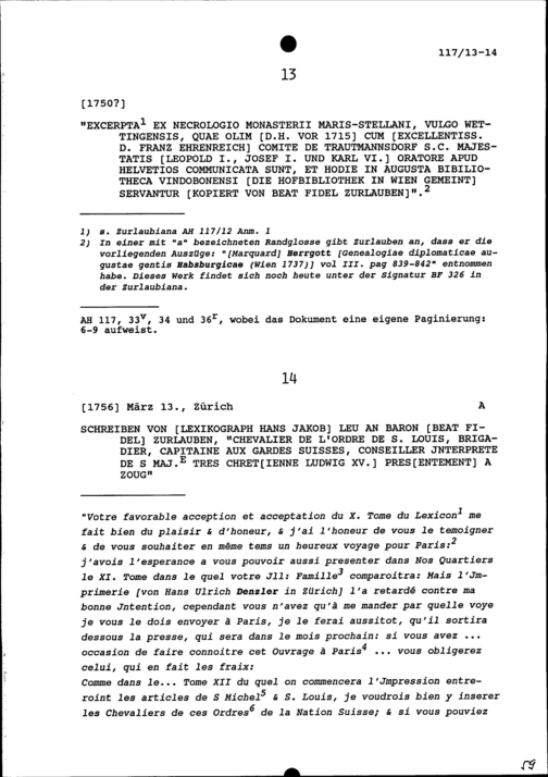 Auszüge aus dem Nekrologium des Klosters Wettingens, kopiert von Beat Fidel Zurlauben