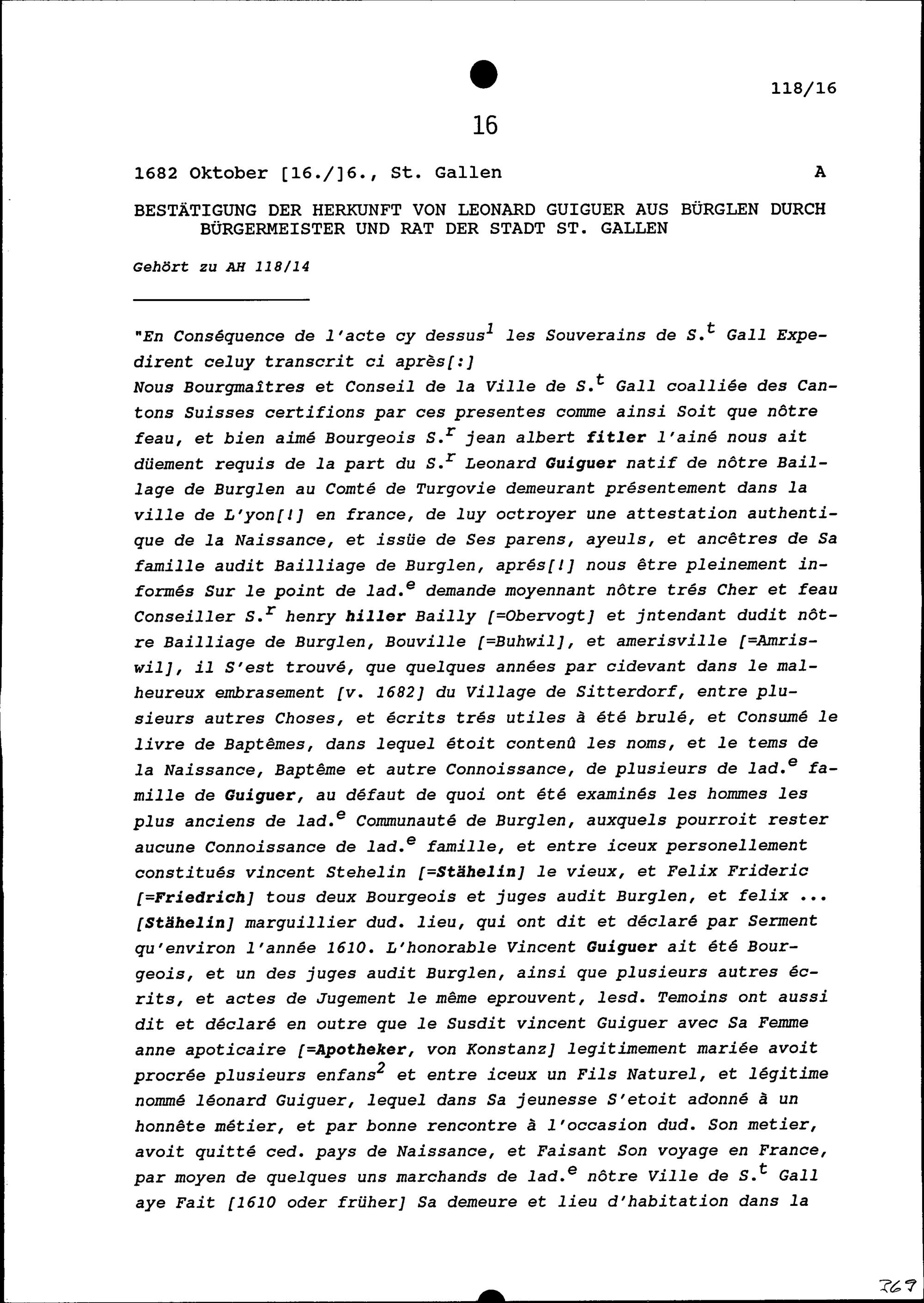 Bestätigung der Herkunft von Leonard Guiguer aus Bürglen durch Bürgermeister und Rat der Stadt Sankt Gallen