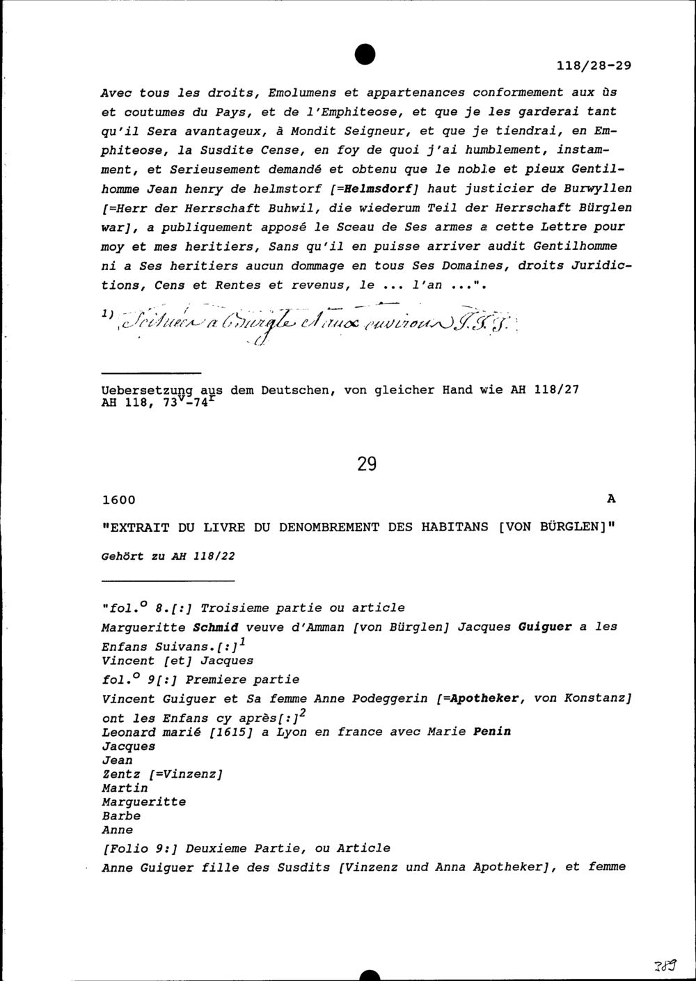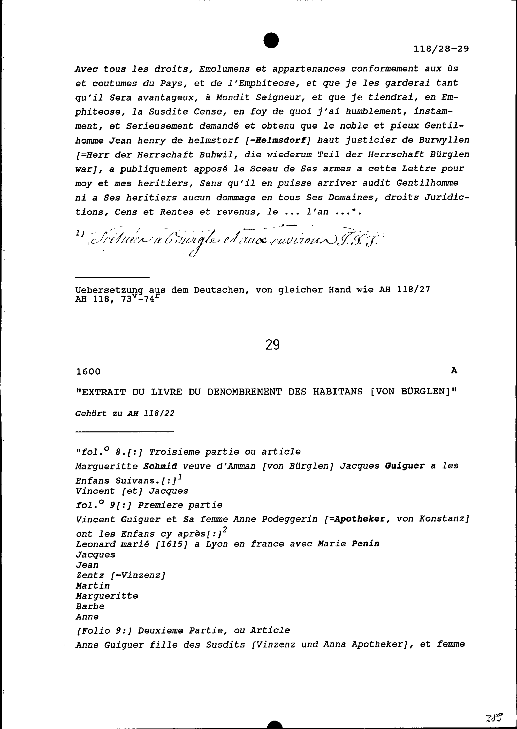 Einwohnerregister von Bürglen die Familie Guiguer betreffend