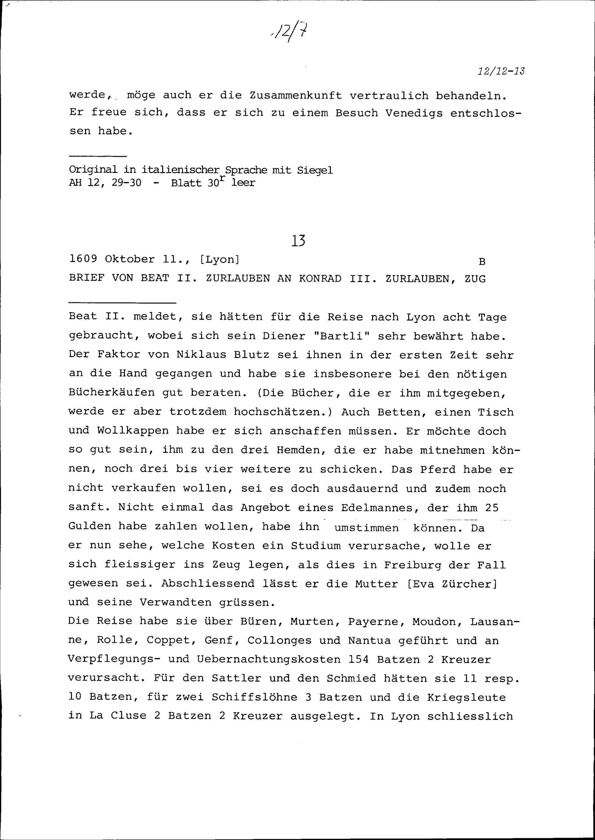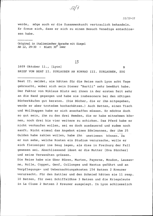 Schreiben von Beat II. Zurlauben an Konrad III. Zurlauben, Zug