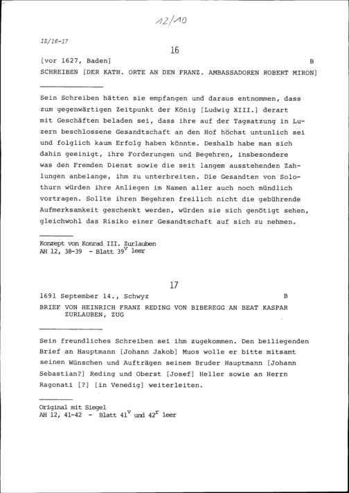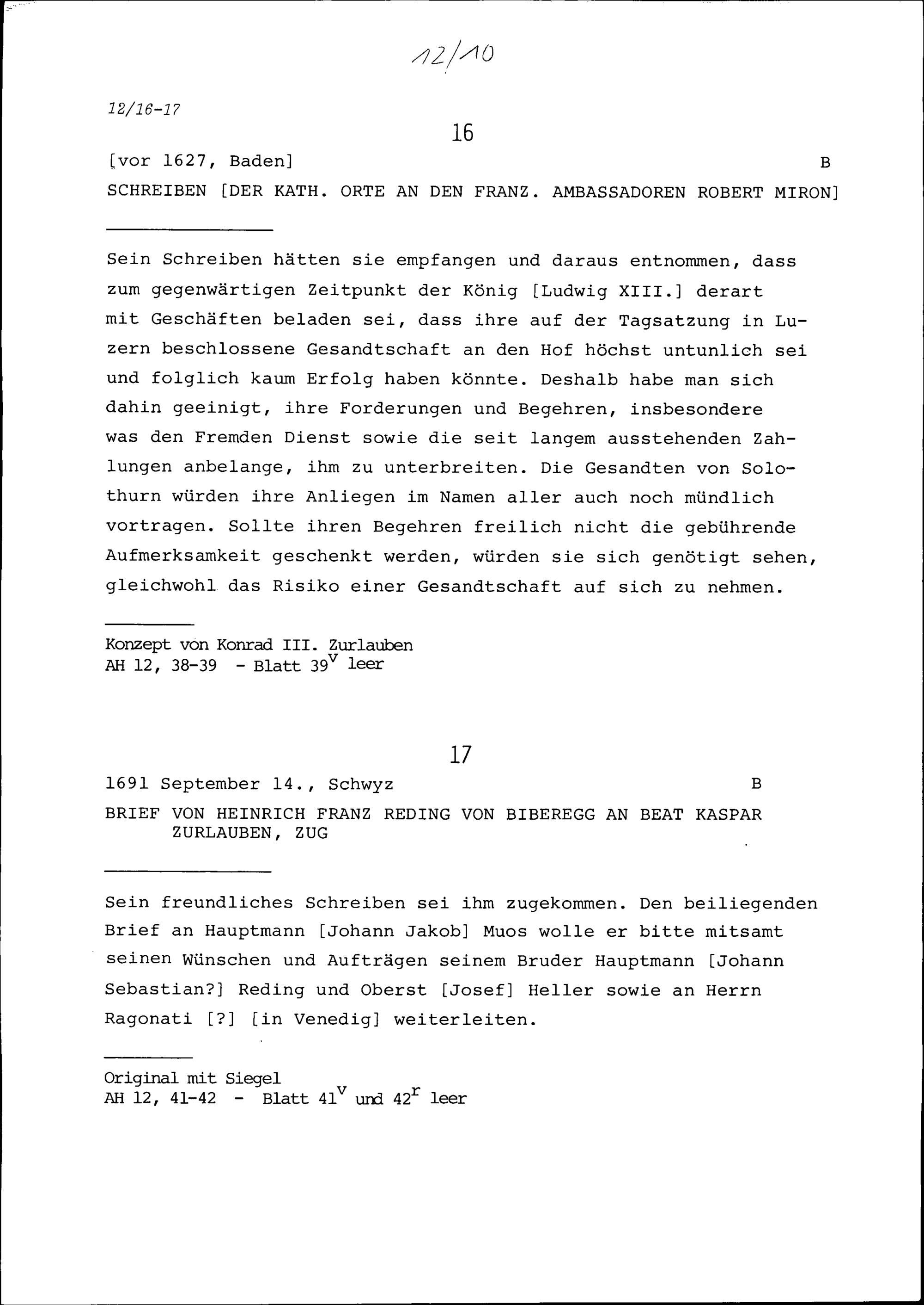 Schreiben der Katholischen Orte an Robert Miron, Ambassador von Frankreich