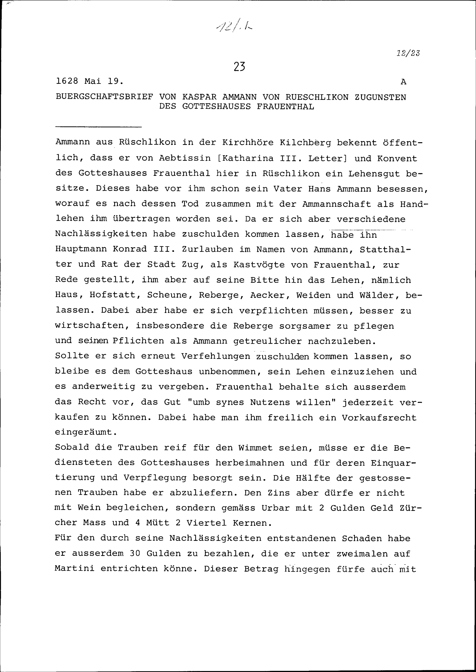 Bürgschaftsbrief von Kaspar Ammann von Rüschlikon zugunsten des Gotteshauses Frauenthal
