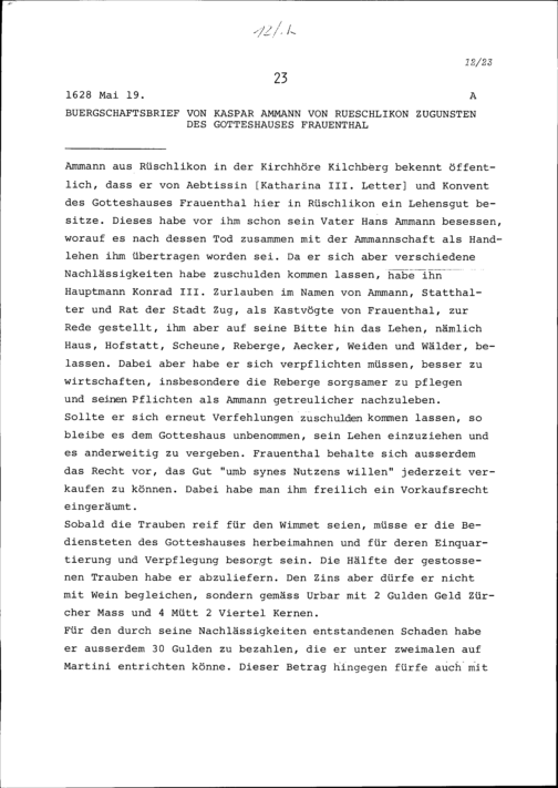 Bürgschaftsbrief von Kaspar Ammann von Rüschlikon zugunsten des Gotteshauses Fra...
