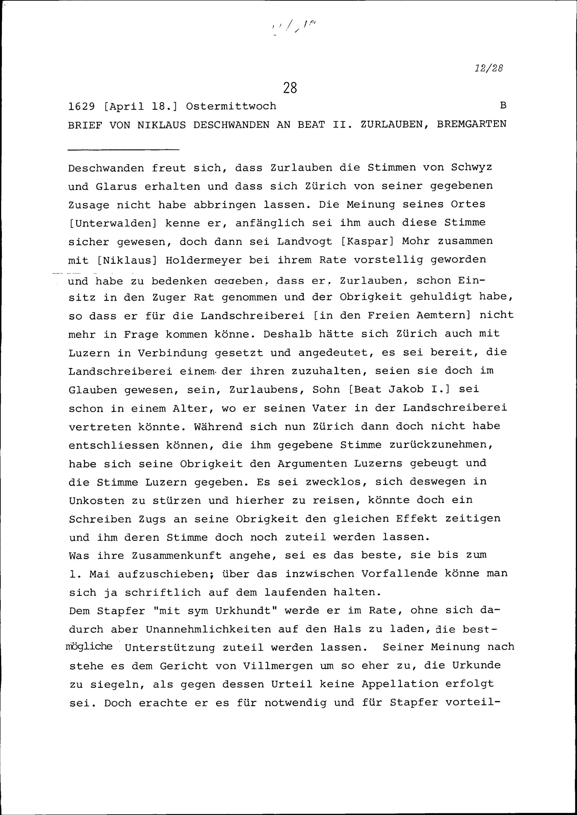 Schreiben von Niklaus Deschwanden an Beat II. Zurlauben, Bremgarten