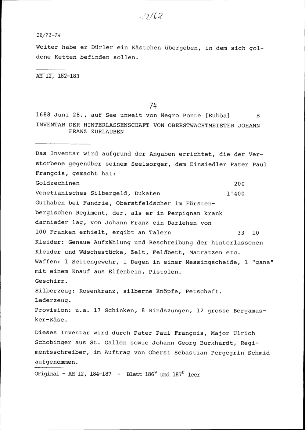 Inventar der Hinterlassenschaft von Johann Franz Zurlauben, Oberstwachtmeister