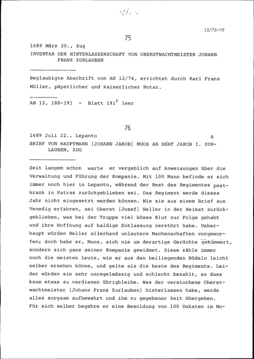 Inventar der Hinterlassenschaft von Johann Franz Zurlauben, Oberstwachtmeister