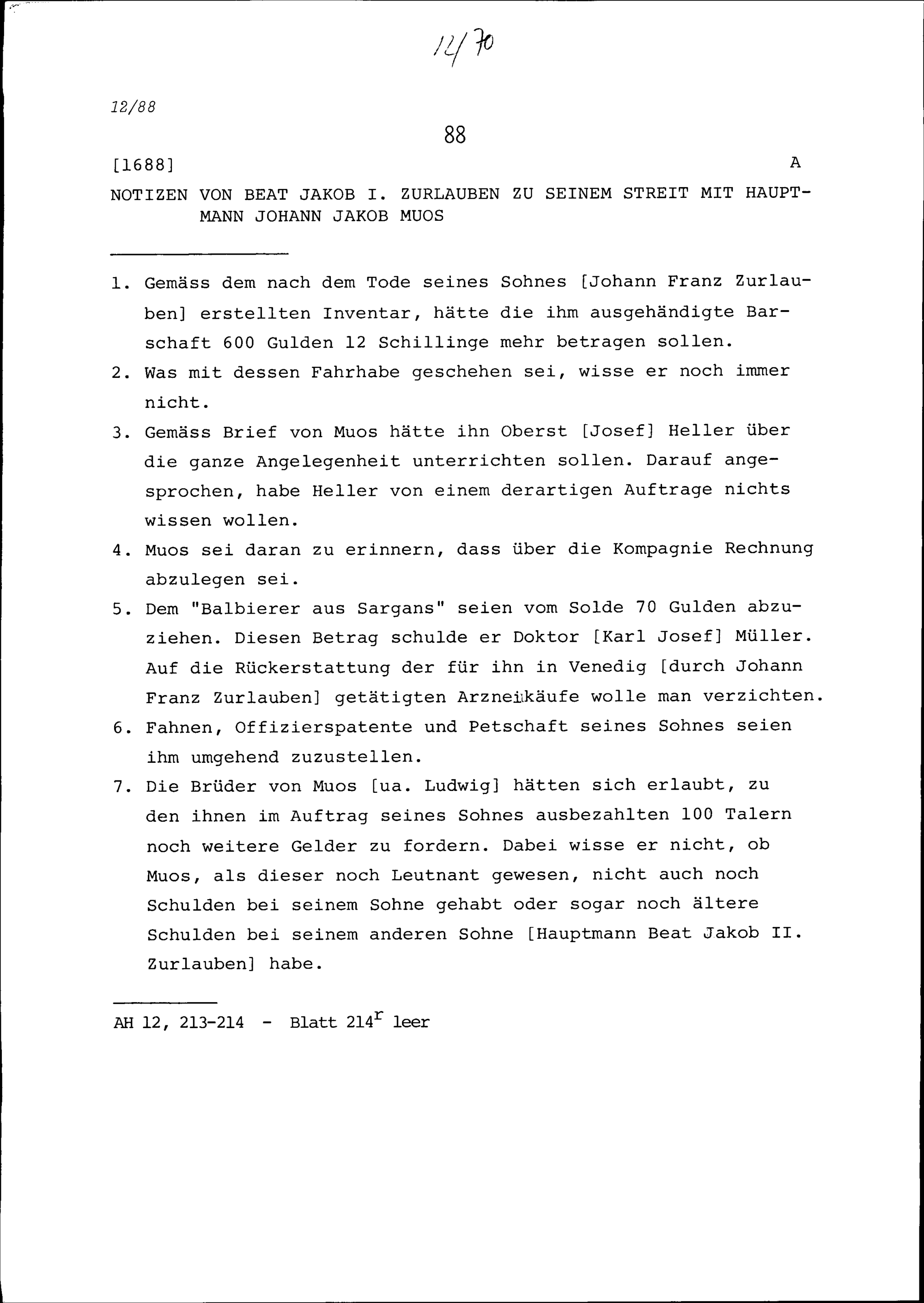 Notiz von Beat Jakob I. Zurlauben zu seinem Streit mit Johann Jakob Muos, Hauptm...