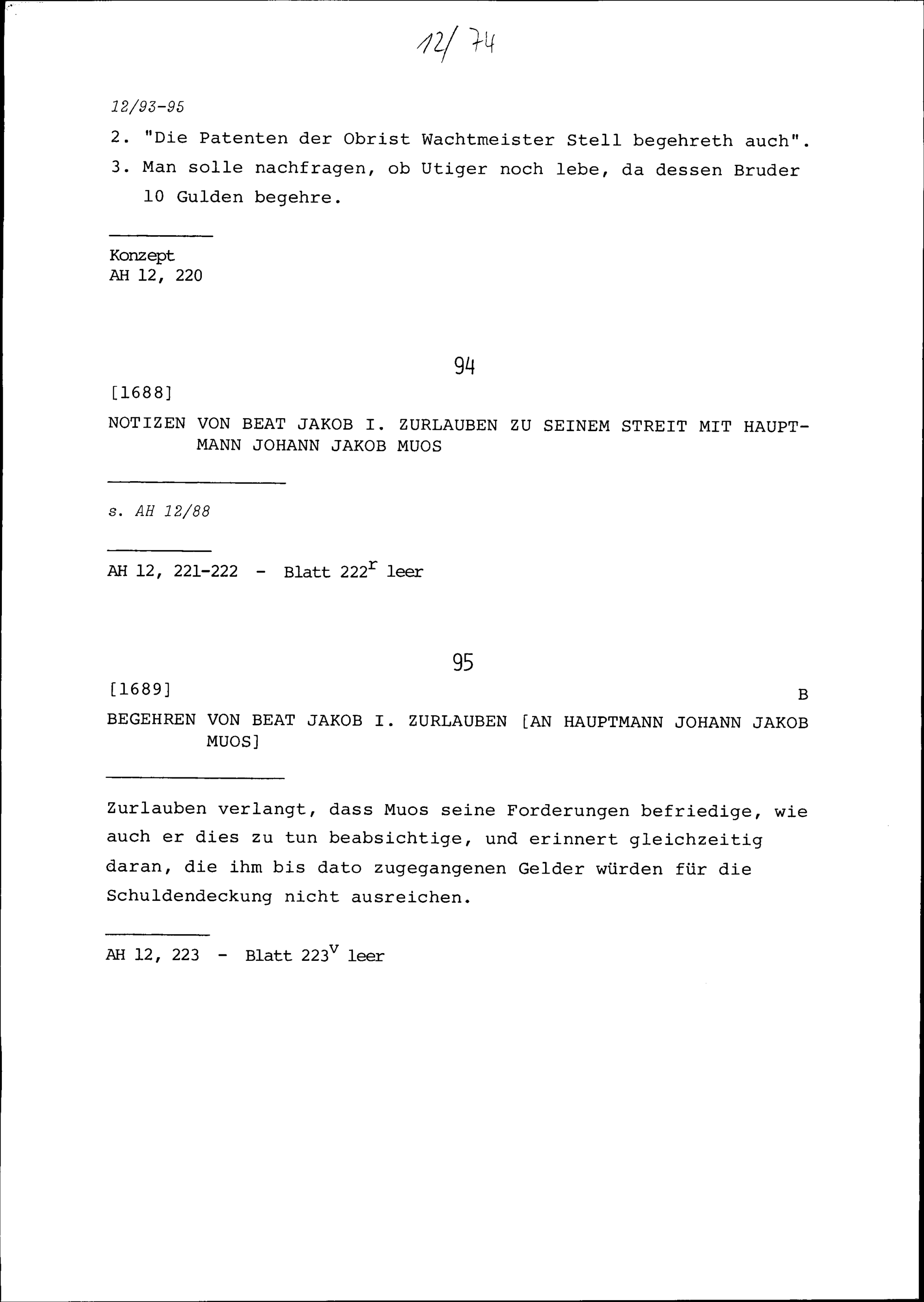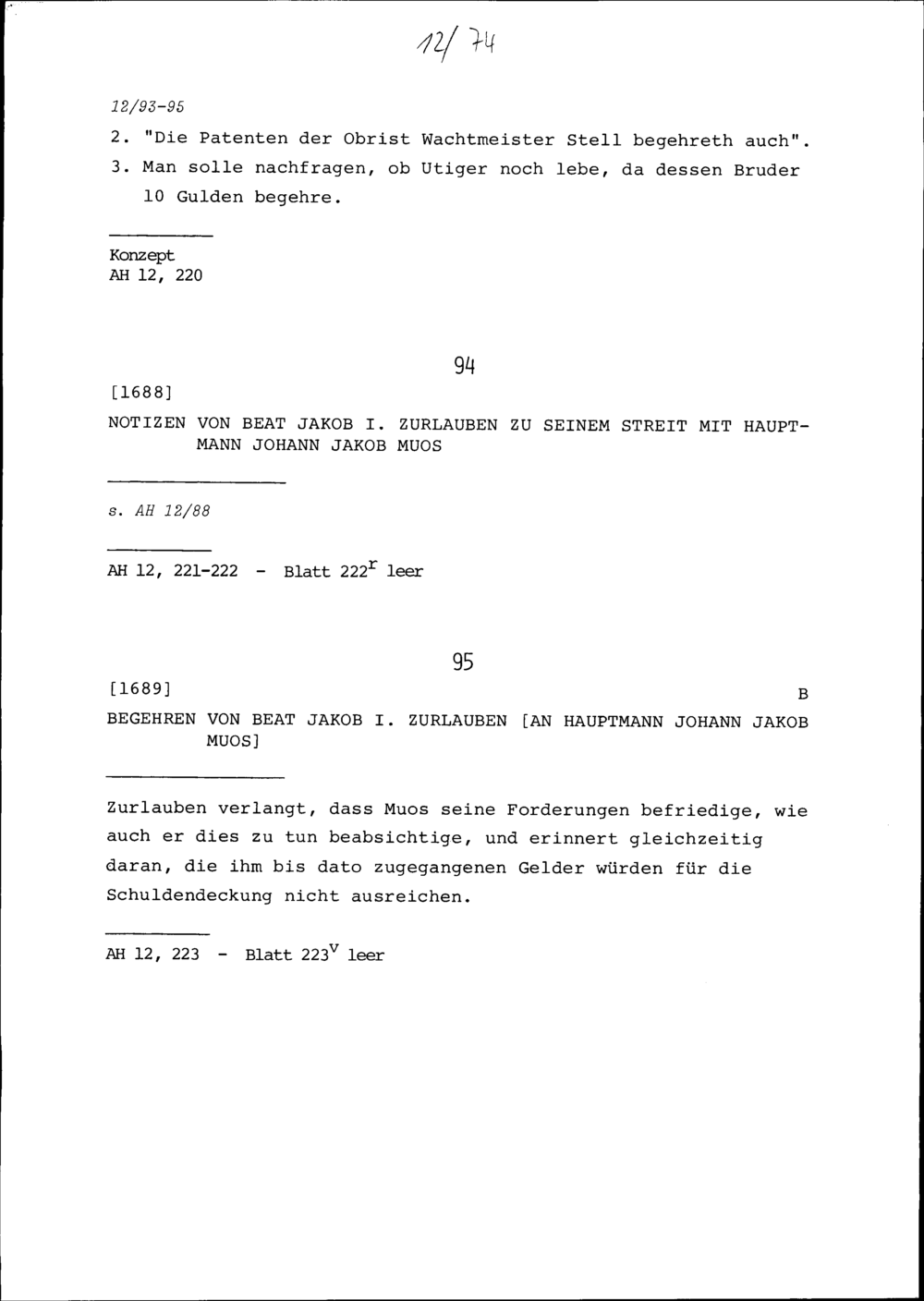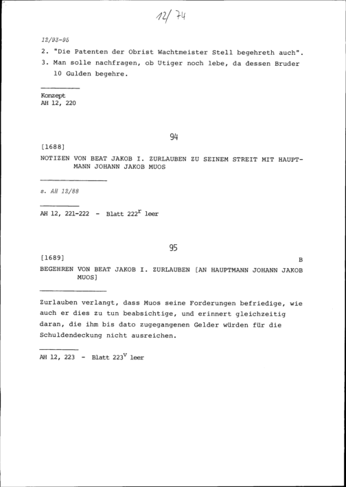Notiz von Beat Jakob I. Zurlauben zu seinem Streit mit Johann Jakob Muos, Hauptm...