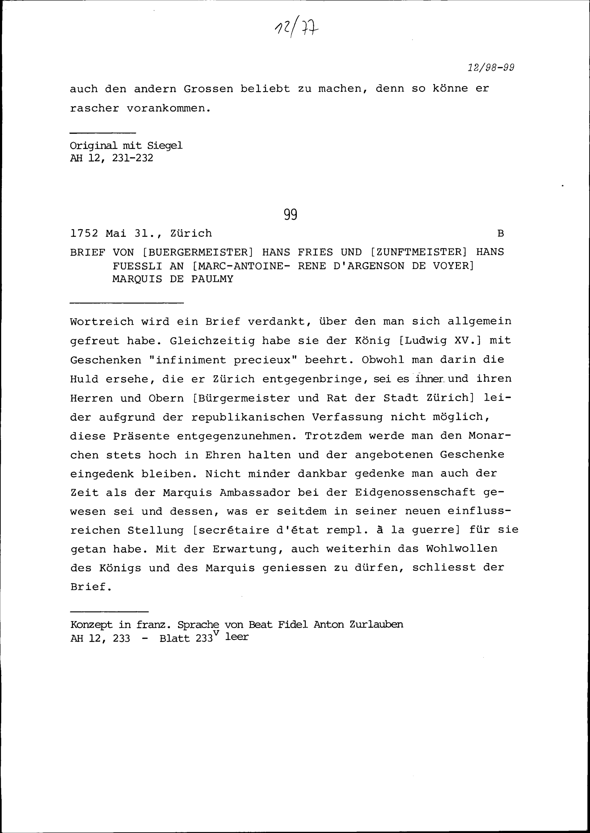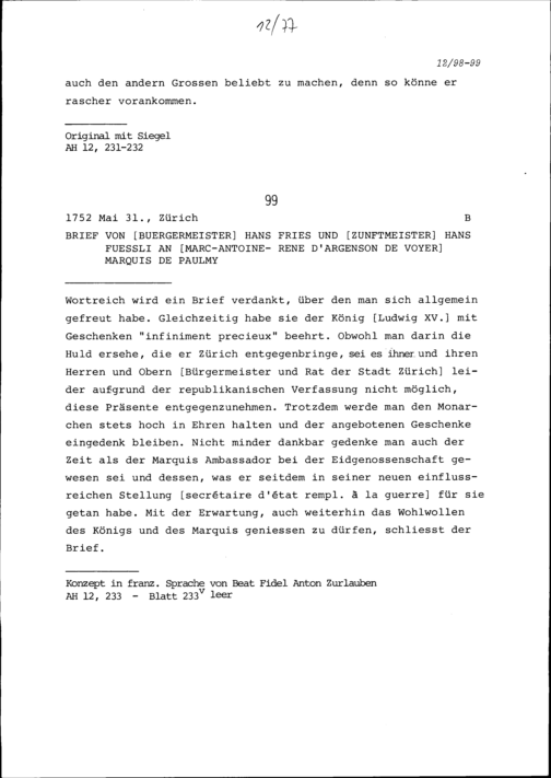 Schreiben von Hans Fries, Bürgermeister, und von Hans Füssli, Zunftmeister, an Marc Antoine René de Voyer, Marquis d'Argenson et Marquis de Paulmy