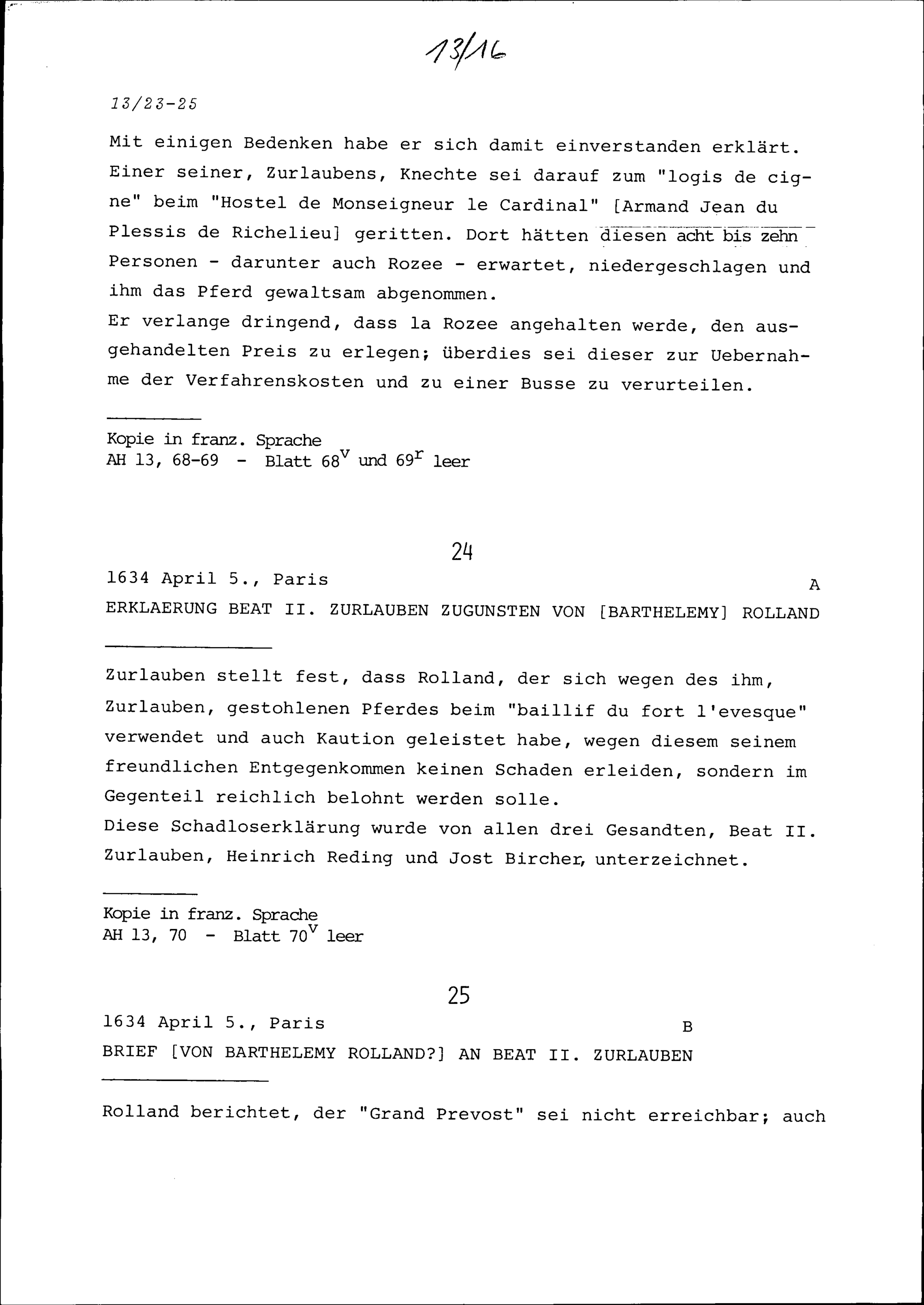 Erklärung Beat II. Zurlauben zugunsten von Barthélémy Rolland