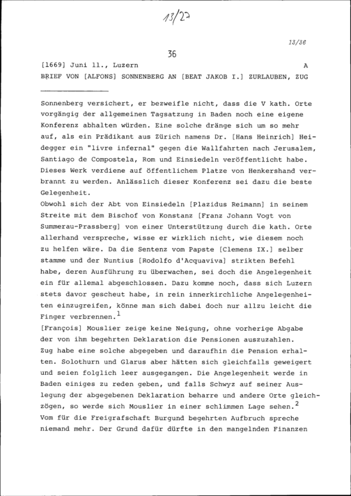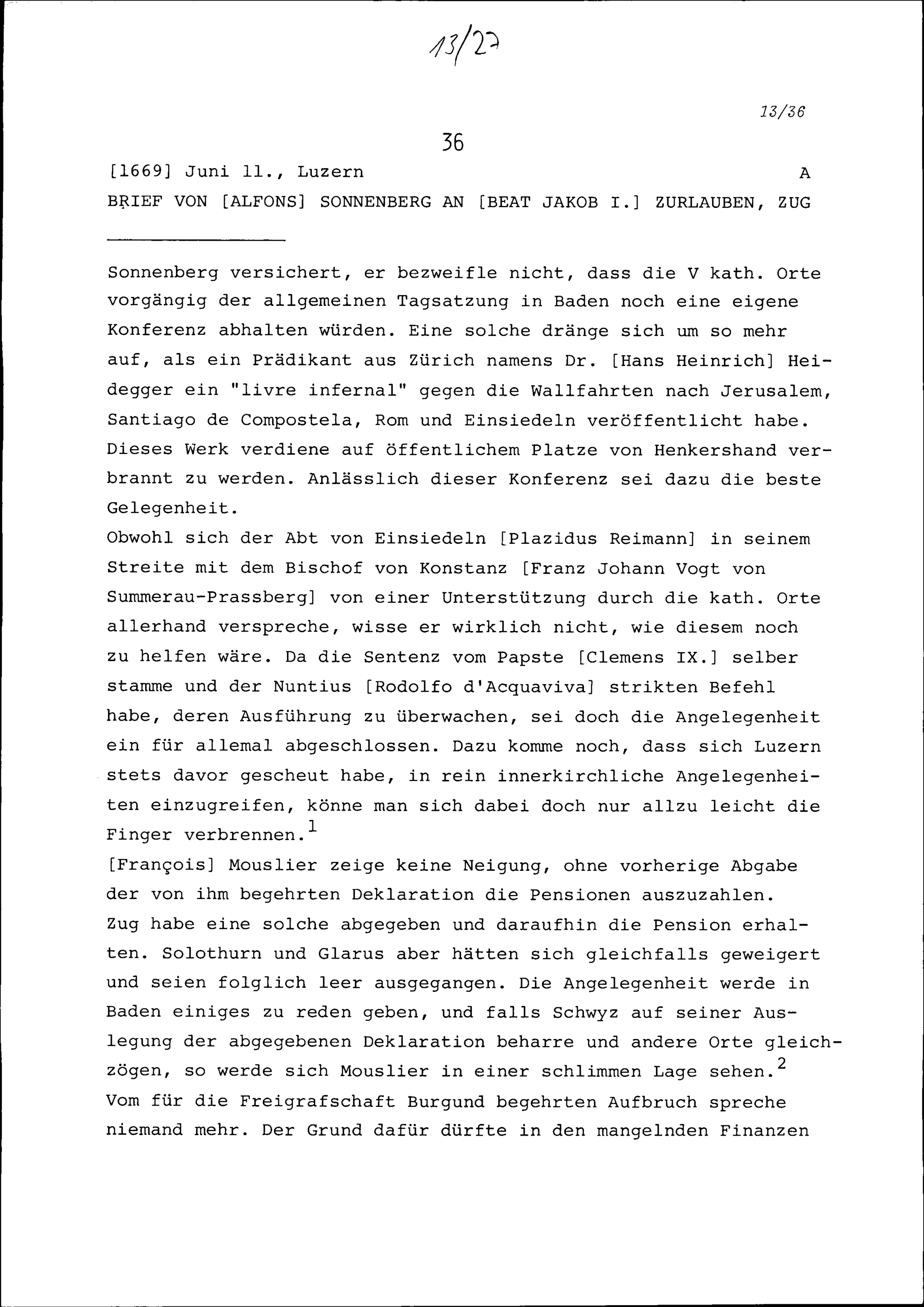 Schreiben von Alfons von Sonnenberg an Beat Jakob I. Zurlauben, Zug