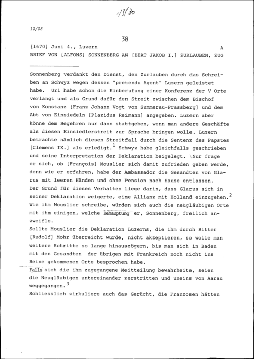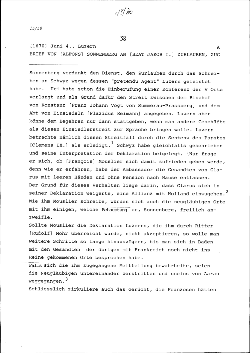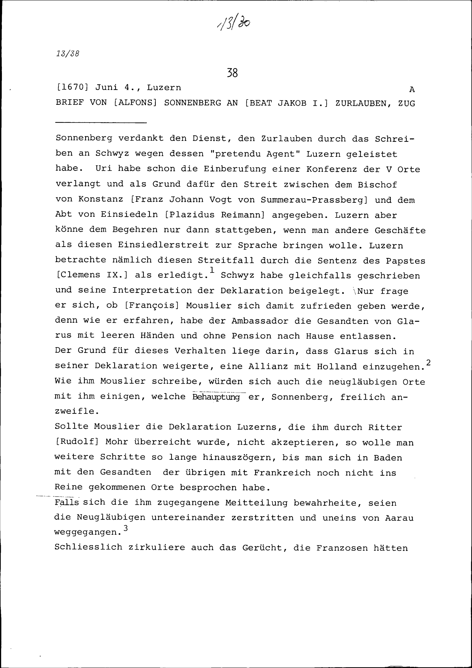 Schreiben von Alfons von Sonnenberg an Beat Jakob I. Zurlauben, Zug