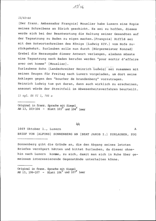Schreiben von Alfons von Sonnenberg an Beat Jakob I. Zurlauben, Zug
