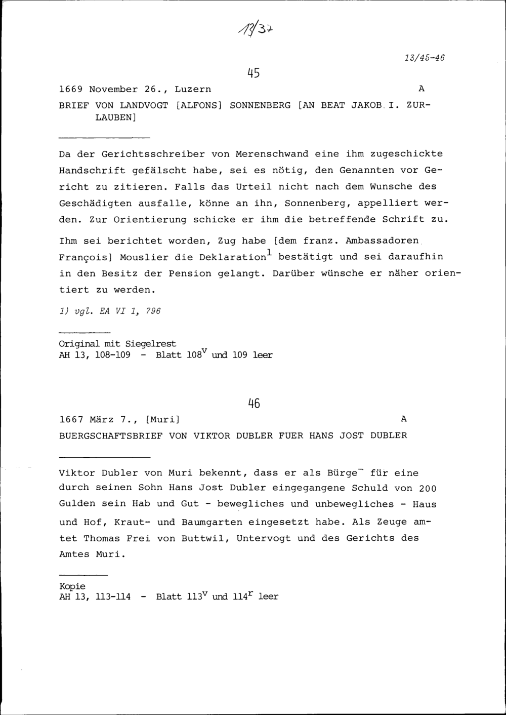 Schreiben von Alfons von Sonnenberg, Landvogt, an Beat Jakob I. Zurlauben