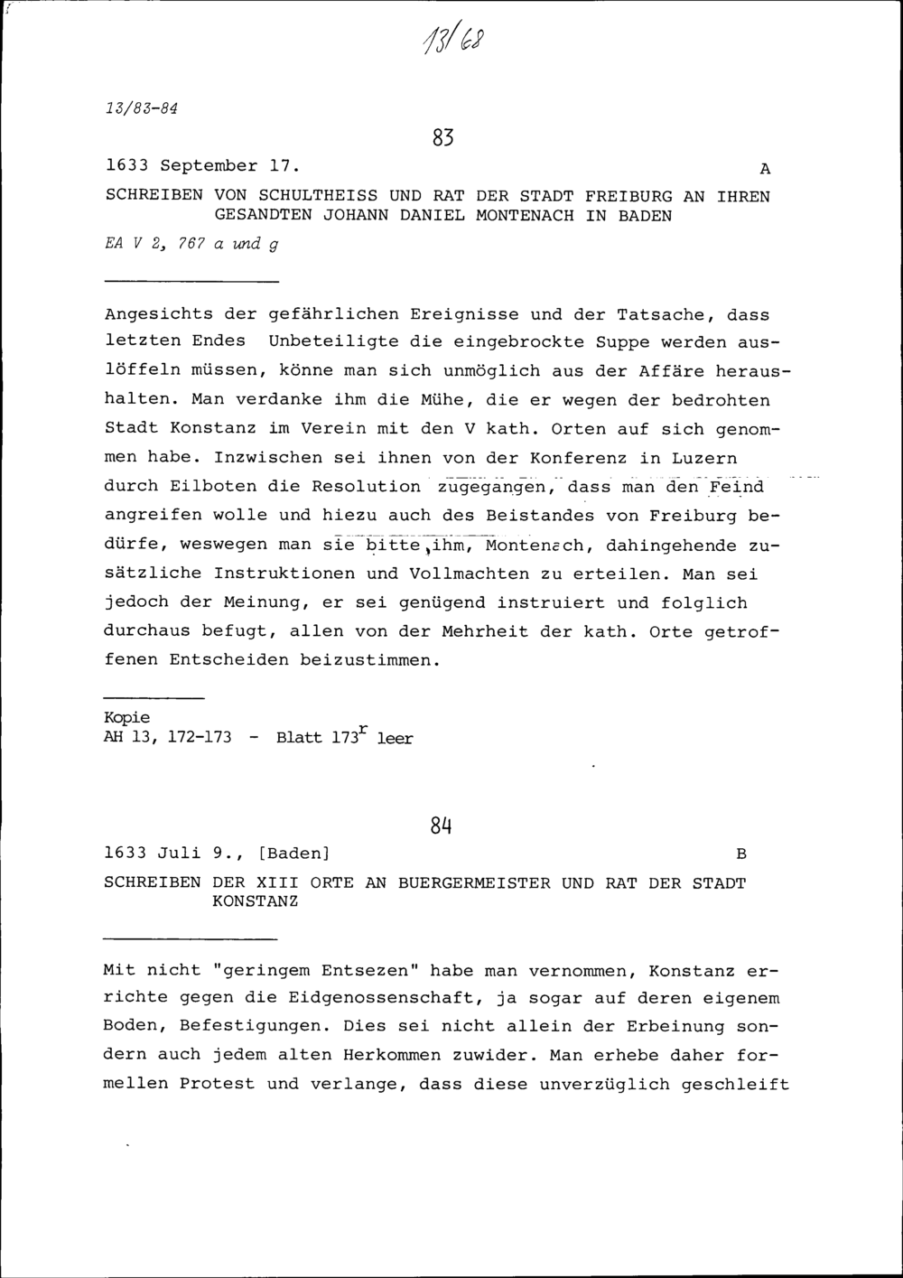 Schreiben des Schultheiss und Rats der Stadt Freiburg an Johann Daniel von Montenach, Gesandter von Freiburg, in Baden