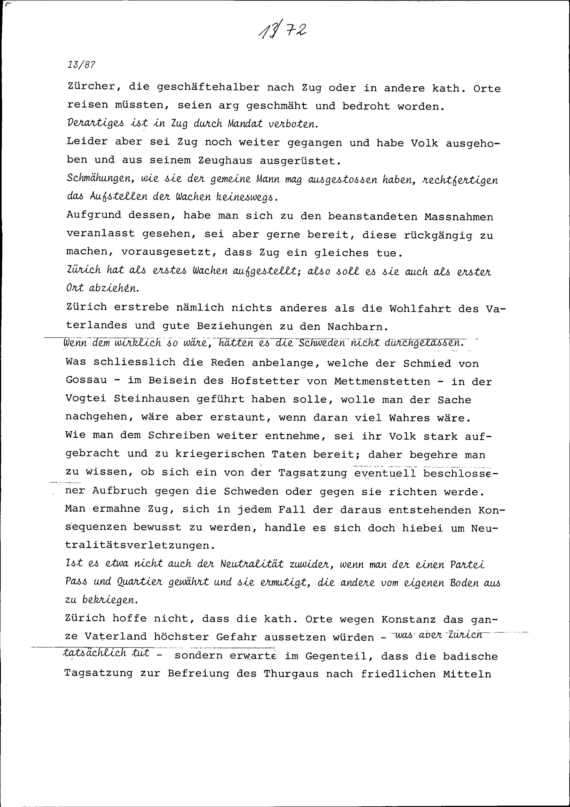 Schreiben des Bürgermeisters und Rats Zürich an Ammann und Rat von Stadt und Amt Zug