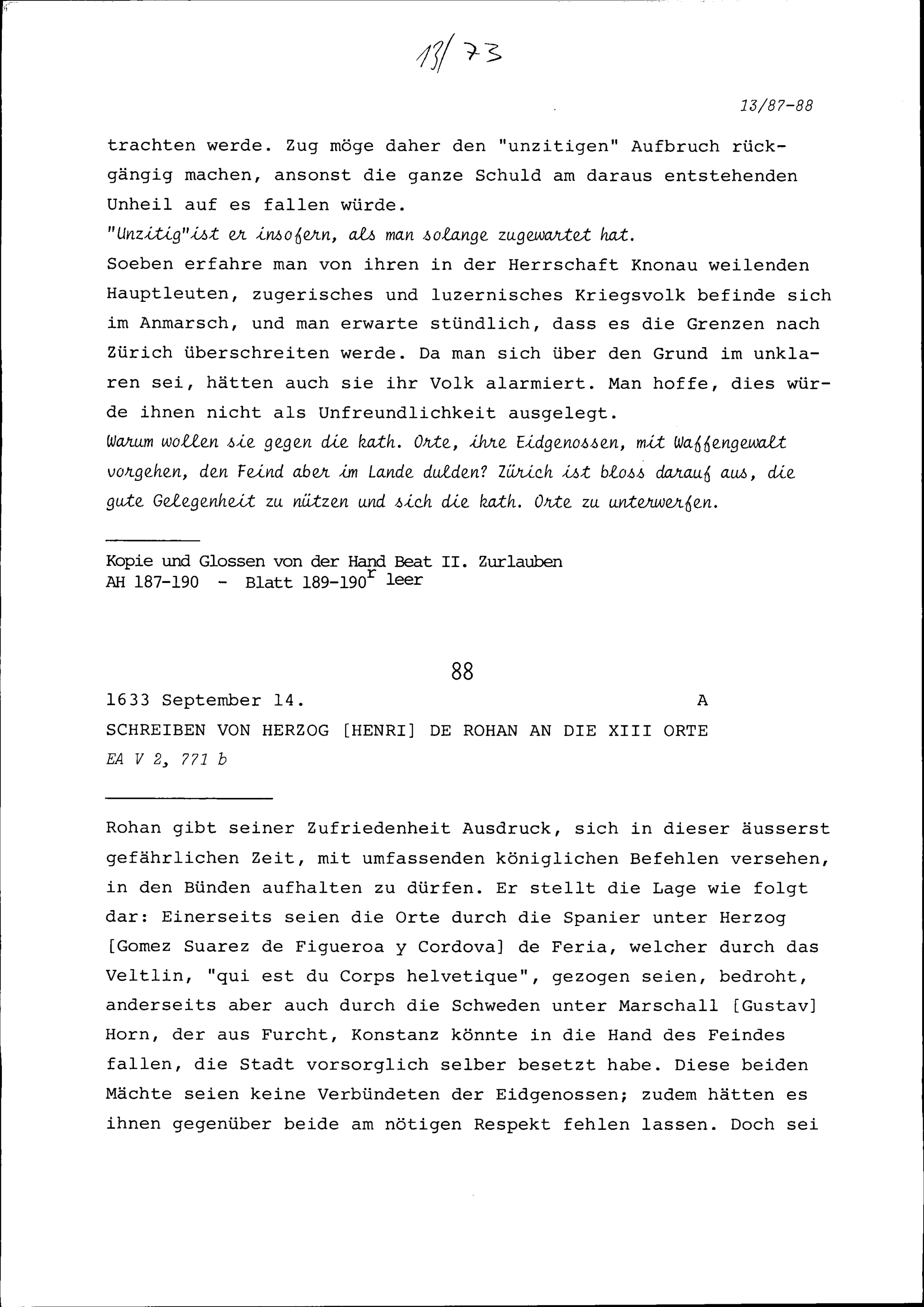 Schreiben von Henri de Rohan, Herzog, an die Dreizehn Orte