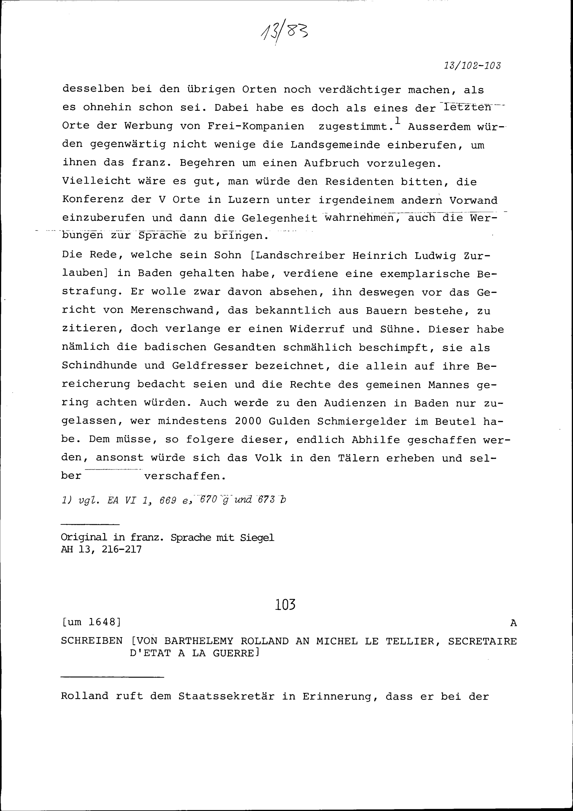 Schreiben von Barthélémy Rolland an Michel Le Tellier, Secrétaire d'état à la gu...