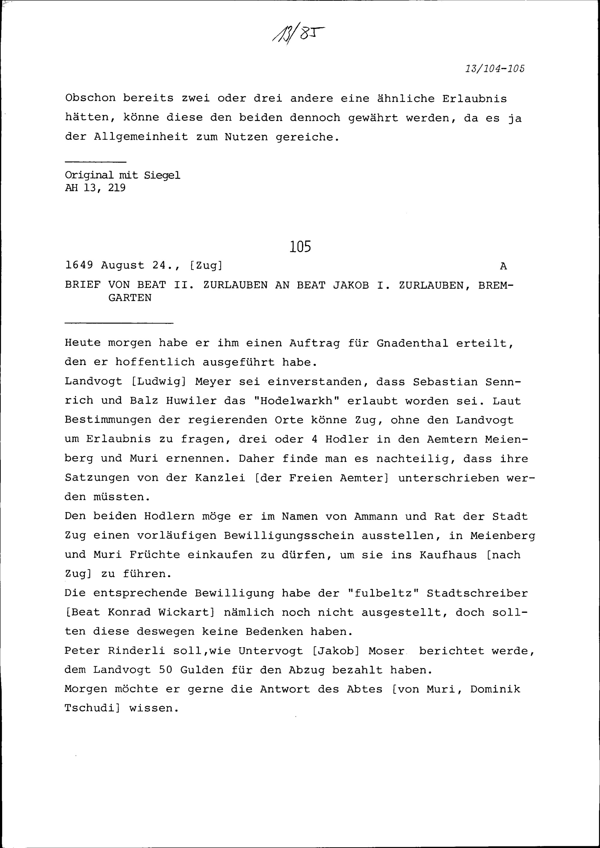 Schreiben von Beat II. Zurlauben an Beat Jakob I. Zurlauben, Bremgarten
