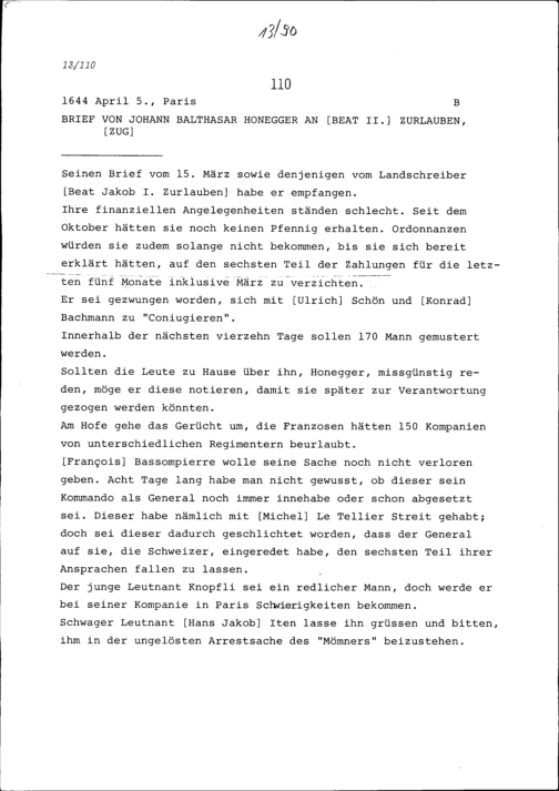 Schreiben von Johann Balthasar Honegger an Beat II. Zurlauben, Zug