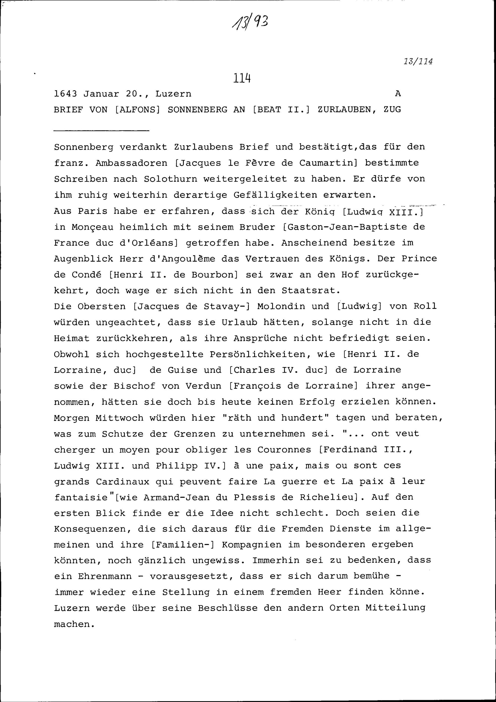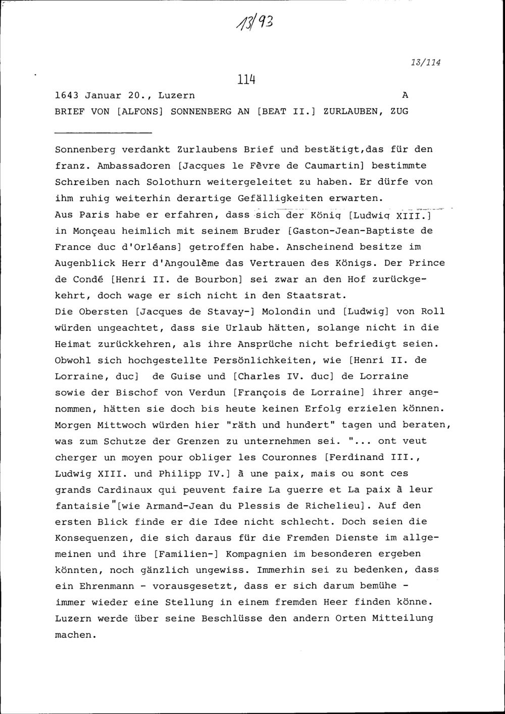 Schreiben von Alfons von Sonnenberg an Beat II. Zurlauben, Zug