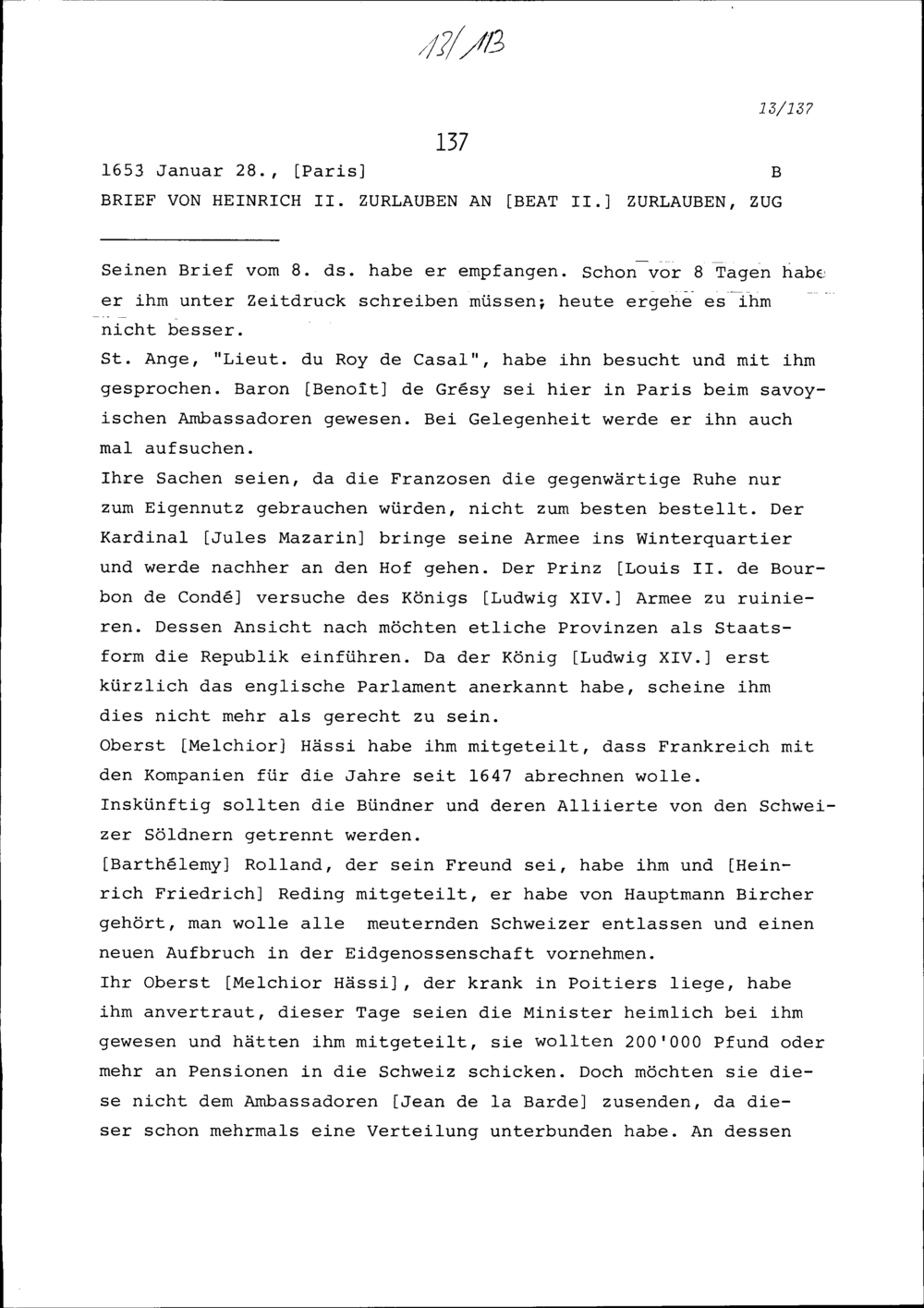 Schreiben von Heinrich II. Zurlauben an Beat II. Zurlauben, Zug