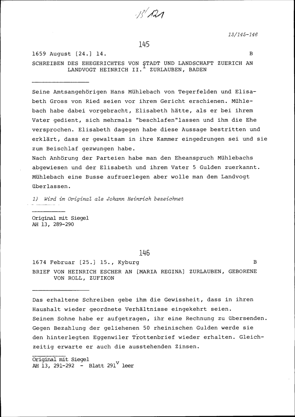 Schreiben des Ehegerichts von Stadt und Landschaft Zürich an Heinrich II. Zurlauben,...