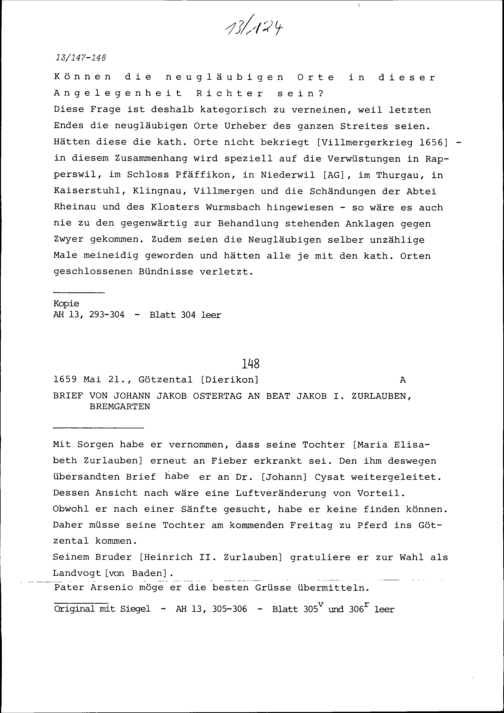 Schreiben von Johann Jakob Ostertag an Beat Jakob I. Zurlauben, Bremgarten