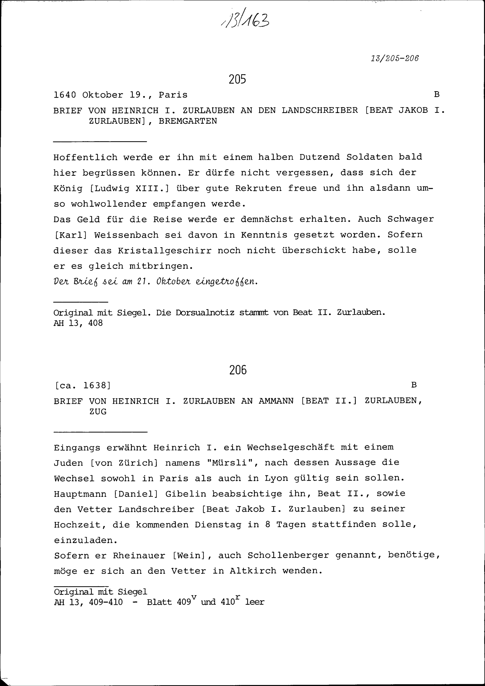 Schreiben von Heinrich I. Zurlauben an Beat Jakob I. Zurlauben, Landschreiber, Bremgarten