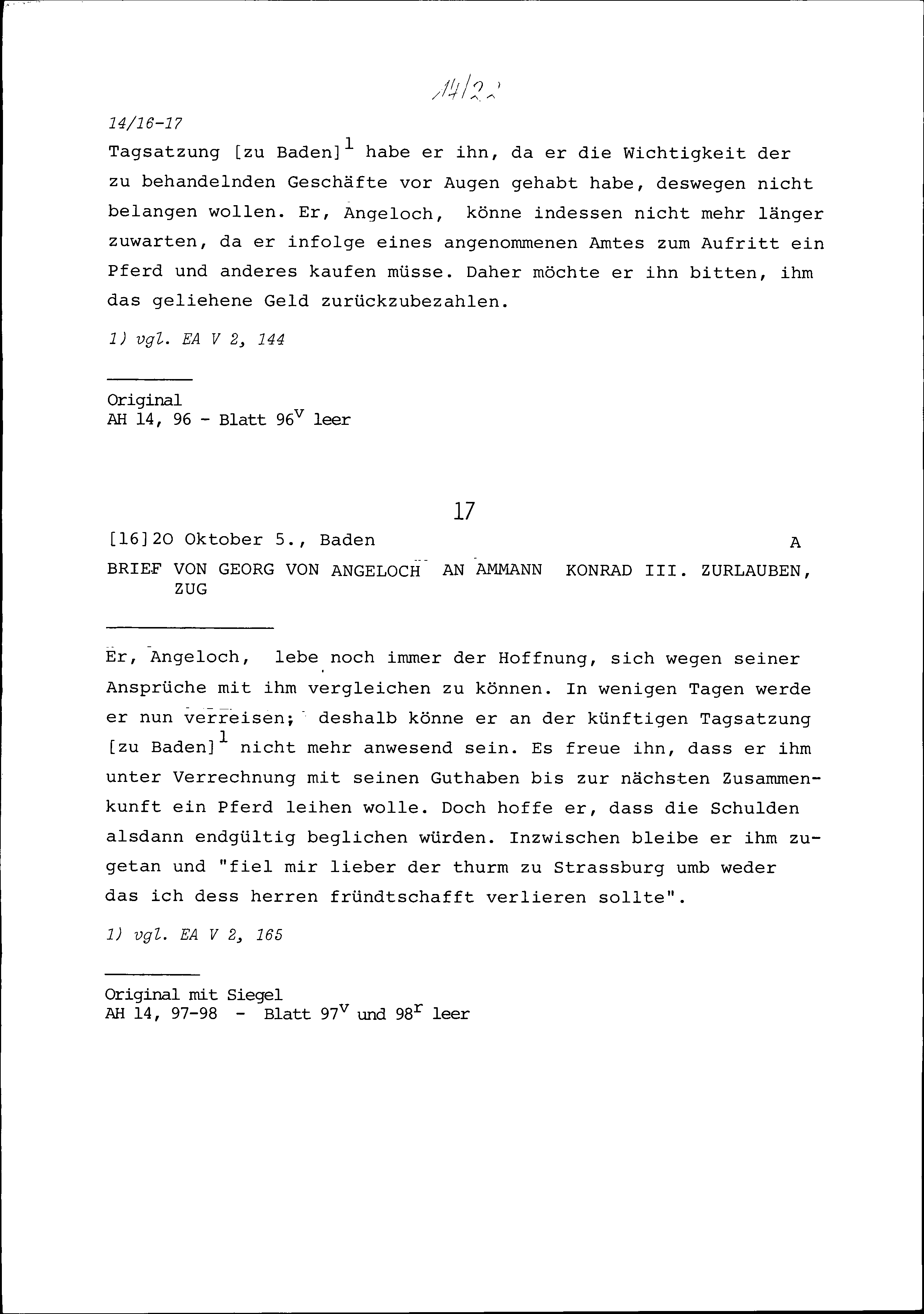 Schreiben von Georg von Angeloch an Konrad III. Zurlauben, Ammann, Zug