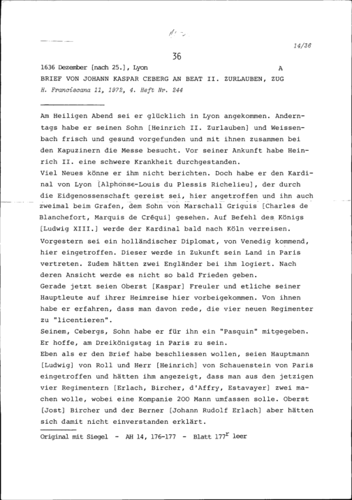 Schreiben von Johann Kaspar Ceberg an Beat II. Zurlauben, Zug